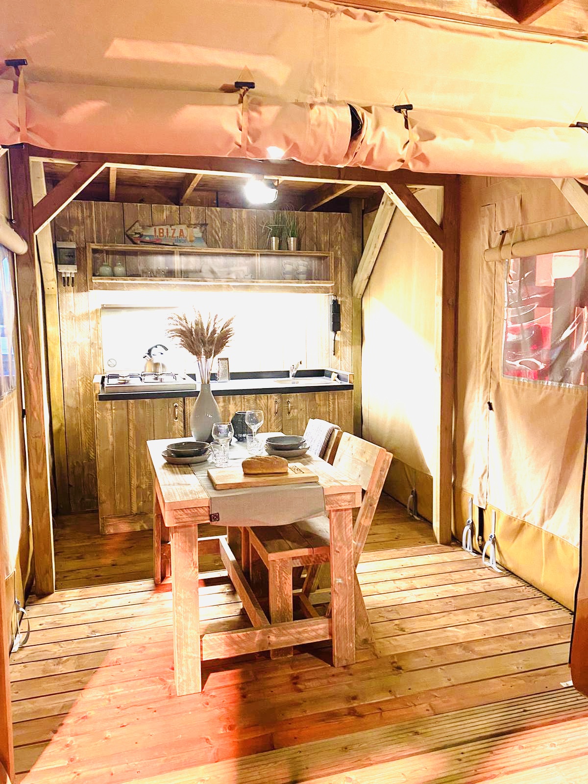 Elke tent heeft een eigen keukenblok. Deze is volledig ingericht met een fornuis, nespresso apparaat, kook- en eetgerei en opbergruimte. De lange buitentafel met banken biedt de mogelijkheid tot een heerlijk diner onder de sterren!