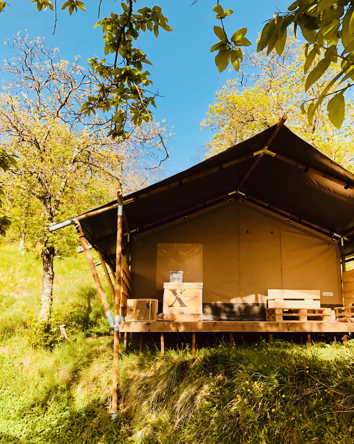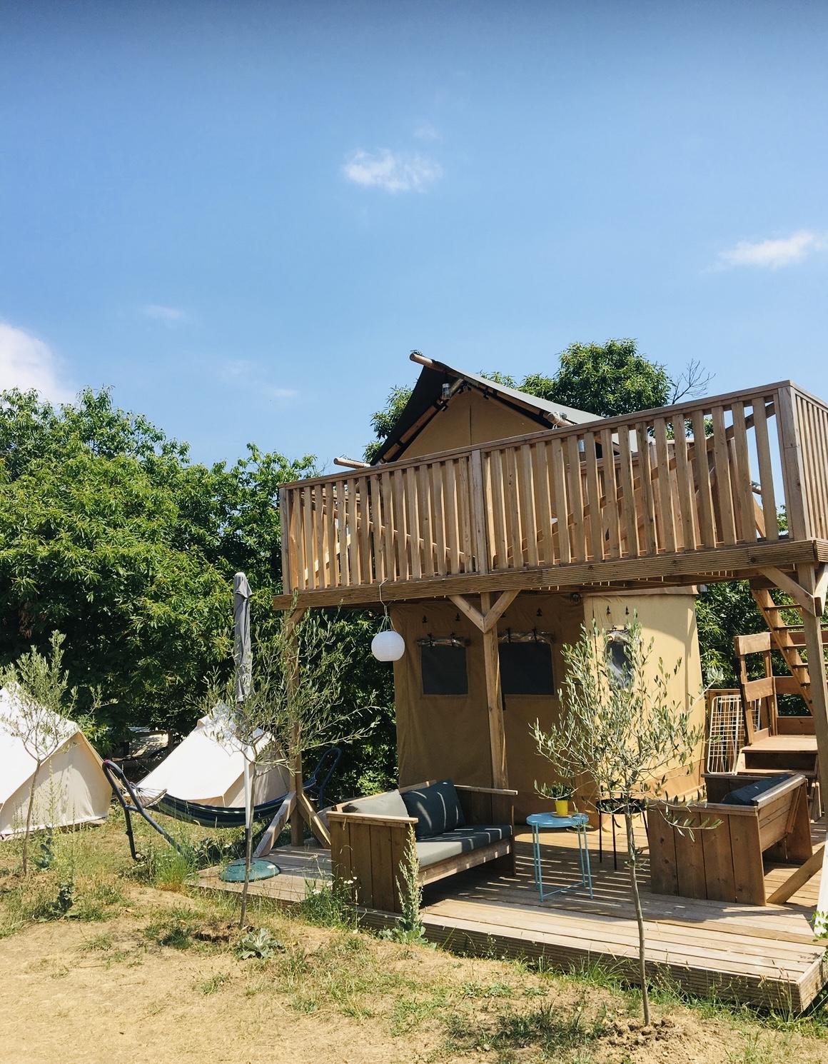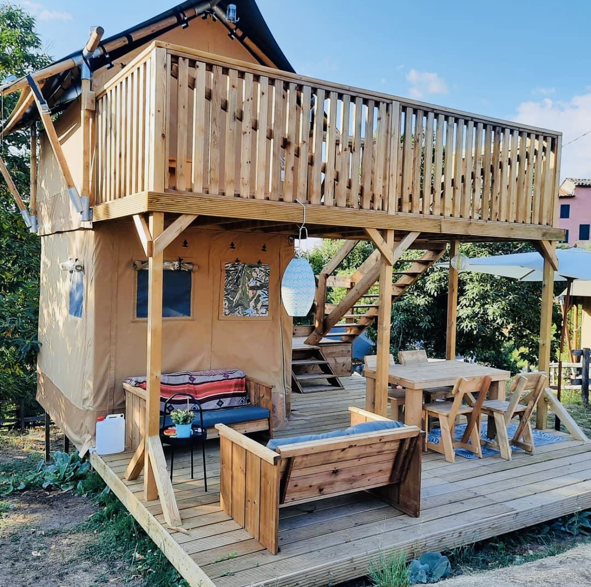 – Glamping Air-Lodge ‘Stella’ met twee verdiepingen, veranda en twee kleine kinder tipi’s voor de kids.