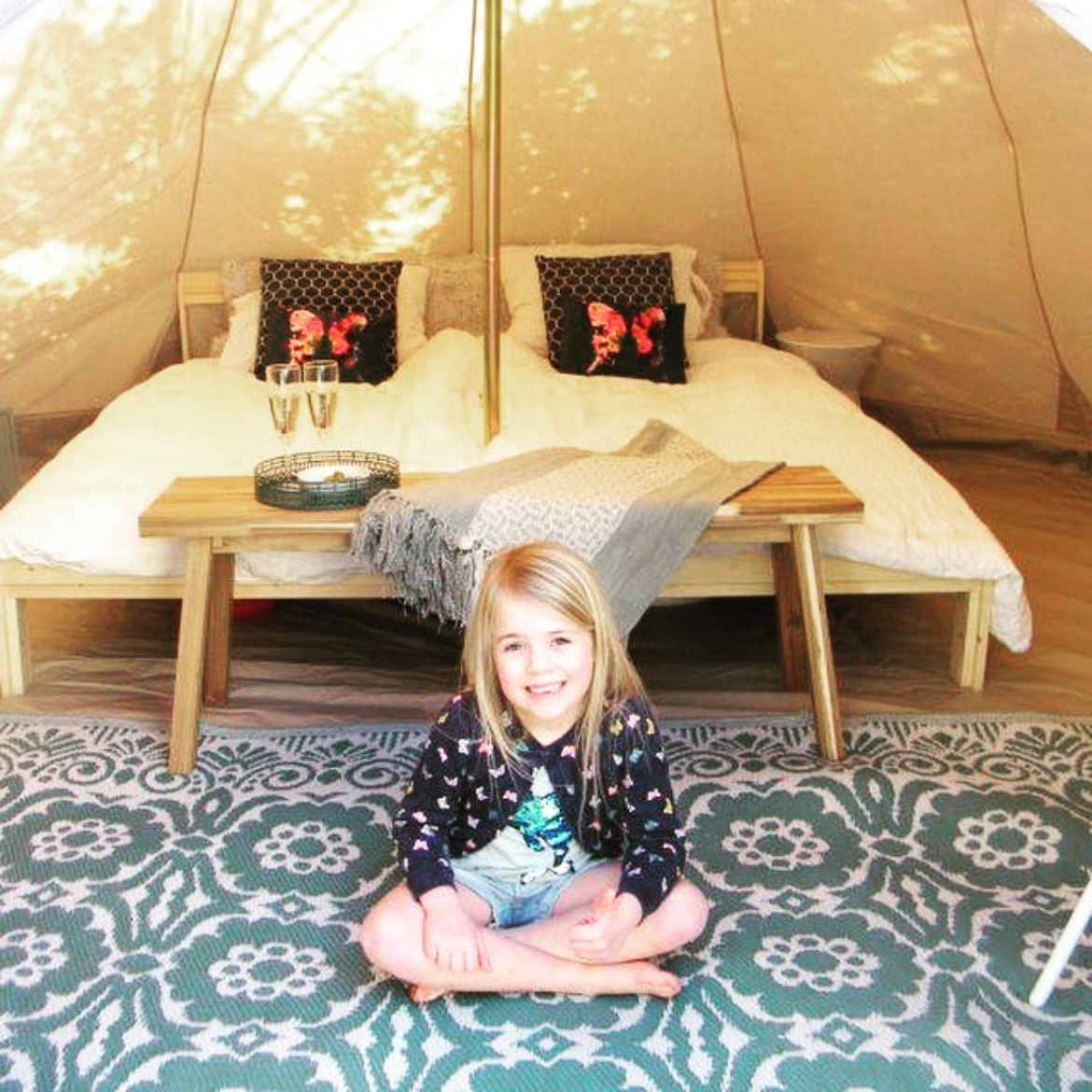 – Glamping Bell tenten ‘Bella’ met kleine tipi voor de kids.
