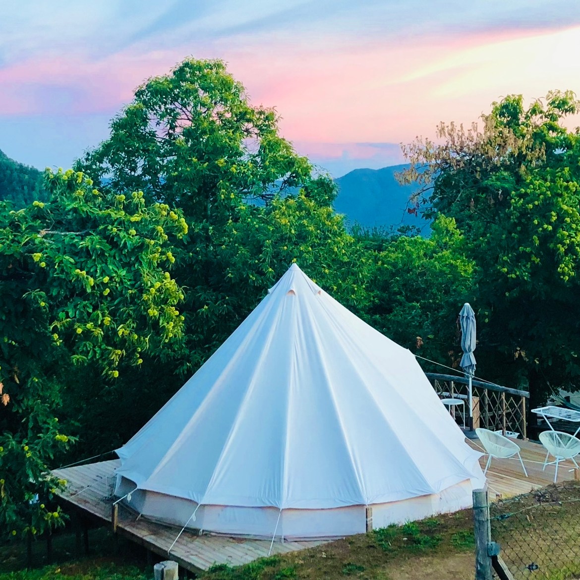 – De Bell tenten ‘BELLA’ zijn glamoureus: “een ronde balzaal” van 6 diameter, met een twee persoonsbed, een zithoekje en opbergruimte. De kleurrijke kleden en sfeerverlichting maken de inrichting compleet. De kinderen kunnen zelf op avontuur in hun eigen tipi, deze staat naast de grote tent opgebouwd. De chill modus kan je vinden in de hangmat onder de boom. De idyllische setting op de camping is adembenemend, zeker bij zonsondergang. De keuken is in de buitenlucht en voor privé gebruik: dineren onder de sterren is vanzelfsprekend!